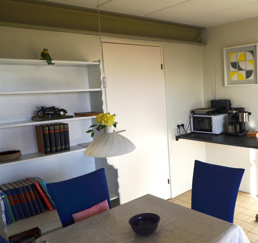 Soveværelse med to enkeltsenge og sofa, der kan laves til dobbeltseng samt sofabord og lænestol. Stor entré med spisebord og tekøkken (m. mikrobølgeovn og køleskab).