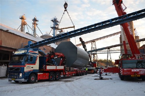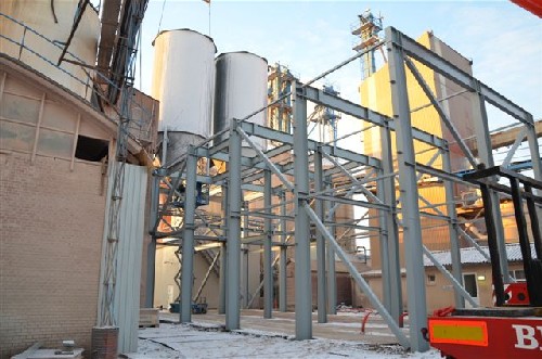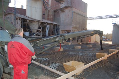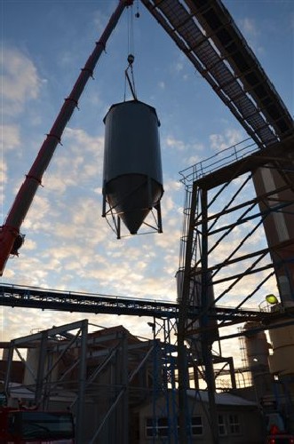 Arbejdet med opsætning af de seks siloer, der i sidste måned blev fragtet til Fur fra Åbybro Maskinfabrik i Gjøl, er færdigt på Damolins fabrik ved Færker Odde. For et par uger siden blev fundamentet støbt. Det krævede 40 lastbillæs beton. Hele 10 betonbiler kørte en dag igennem i pendulfart mellem Fur og Mors efter beton.