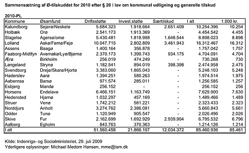 I nedenstående skema ses tilskuddene til de forskellige kommuner med småøer i Danmark.