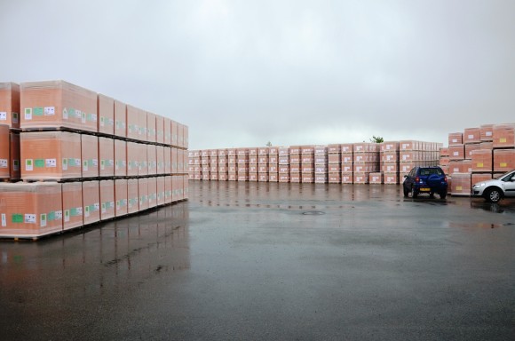 6. Sten på paller pakket i plastik klar til at blive sendt til adresser i fjerne lande