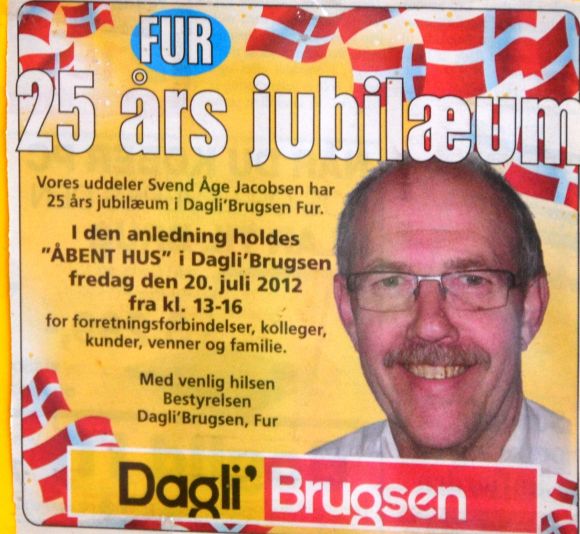 Fredag den 20. juli kunne uddeler Svend Åge Jacobsen fejre, at han har stået i spidsen for Dagli’Brugsen på Fur i 25 år. Det blev fejret med en reception i Brugsen. Mange mødte op for at takke for indsatsen