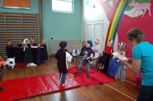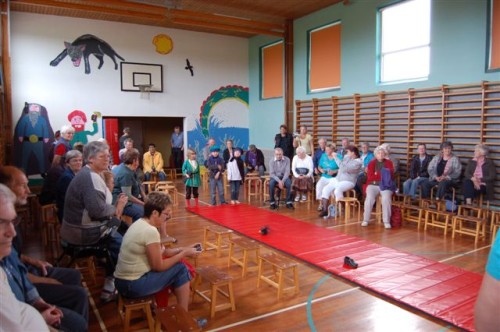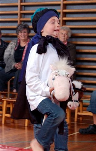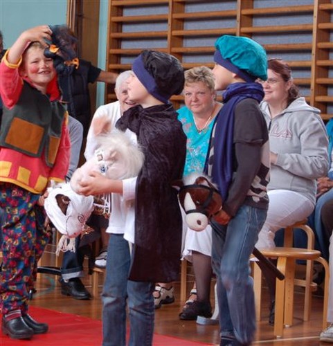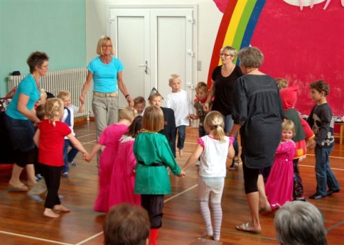 Flaget var hejst som tegn på, at i dag var der noget særligt på færde. Det var der også, for kl. 9.30 begyndte det at vælte ind med folk, i hvis barndom børnehave var et ukendt begreb. Bedsteforældrene var længe ventet, og børnene havde i dagene op til øvet sig på at spille ”Klodshans”. Så da formiddagskaffen var indtaget, gik det til skolens gymnastiksal, hvor der var sat stole op. Her viste børnene, hvordan Klodshans ridende på en ged fik prinsessen og det halve kongerige.