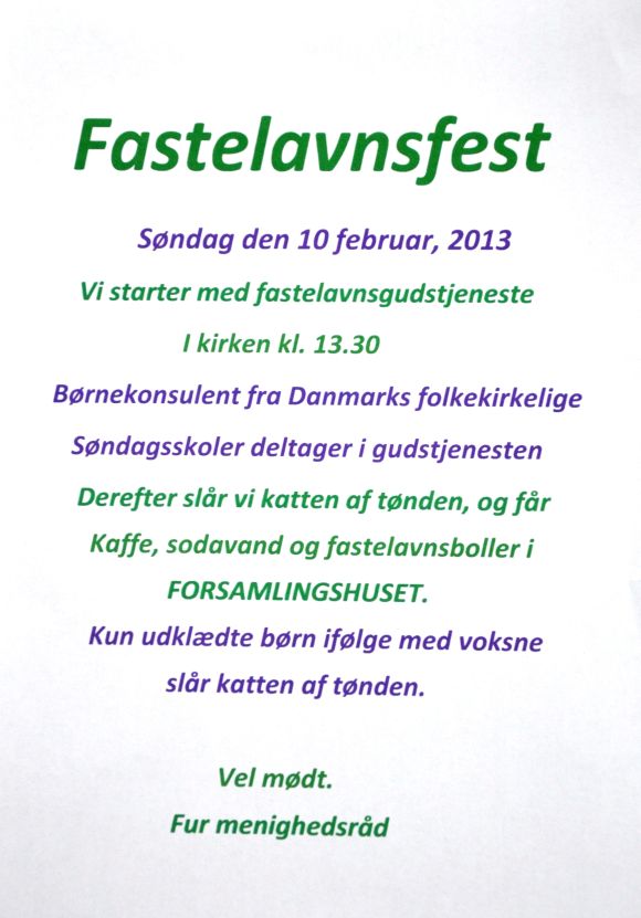 Fastelavnsfest - søndag den 10. februar 2013 - gudstjeneste kl 13:30 - derefter slår vi katten af tønden i forsamlingshuset