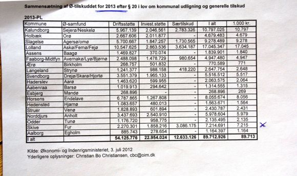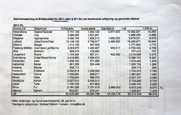 Gennem flere år har der været rejst spørgsmål om, hvad de godt 7,2 millioner Skive Kommune eksempelvis modtager i 2013 i ø-tilskud bliver brugt til. Det spørgsmål er nu kommer nærmere et svar, idet Økonomi- og Indenrigsministeriets Finansieringsudvalg har bedt kommunerne og heriblandt Skive Kommune om at udfylde et spørgeskema om, hvad pengene går til. Ø-tilskuddet er ikke en 100% udligning, men som navnet antyder et tilskud, hvor kommunen selv skal lægge en del midler til. Efter hvad FurNyt har fået oplyst var satsen tidligere 33 %, mens der i den sidste lov ikke er sat % sats på.