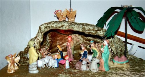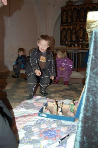 Inde i kirken satte børnene sig på trappetrinnet op til koret. Her fik præst og børn sig en lille snak om julens budskab. Maria, jo børnene kendte godt Maria. Flere kendte endda nogle, som hed Maria. En havde således en storesøster, der havde en veninde, der hed det navn. Og Jesus, hvis fødselsdag julen minder os om, var de også helt på det rene med. På et lille bord oppe i koret var sat en krybbe op, hvortil der hørte små lerfigurer. Hver enkelt barn, pædagog og journalist skulle vælge en figur og sætte op i julekrybben. Den yngste valgte først og så fremdeles. Hver gang en figur blev valgt, blev der fortalt lidt om den. Som den sidste var det journalistens tur. Han valgte en ko, der tilsyneladende lå fredeligt og tyggede drøv. Den mindede ham om barndommen på landet for mange, mange år siden.