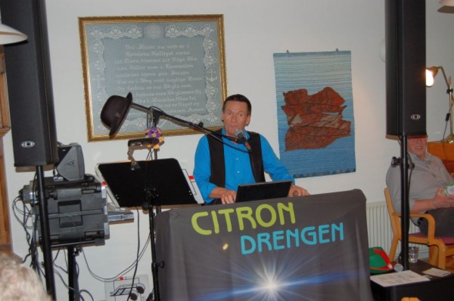 Han havde sin medhjælper Kurt med, som sørgede for at uddele deres medbragte sanghæfter, som vi så sang efter.