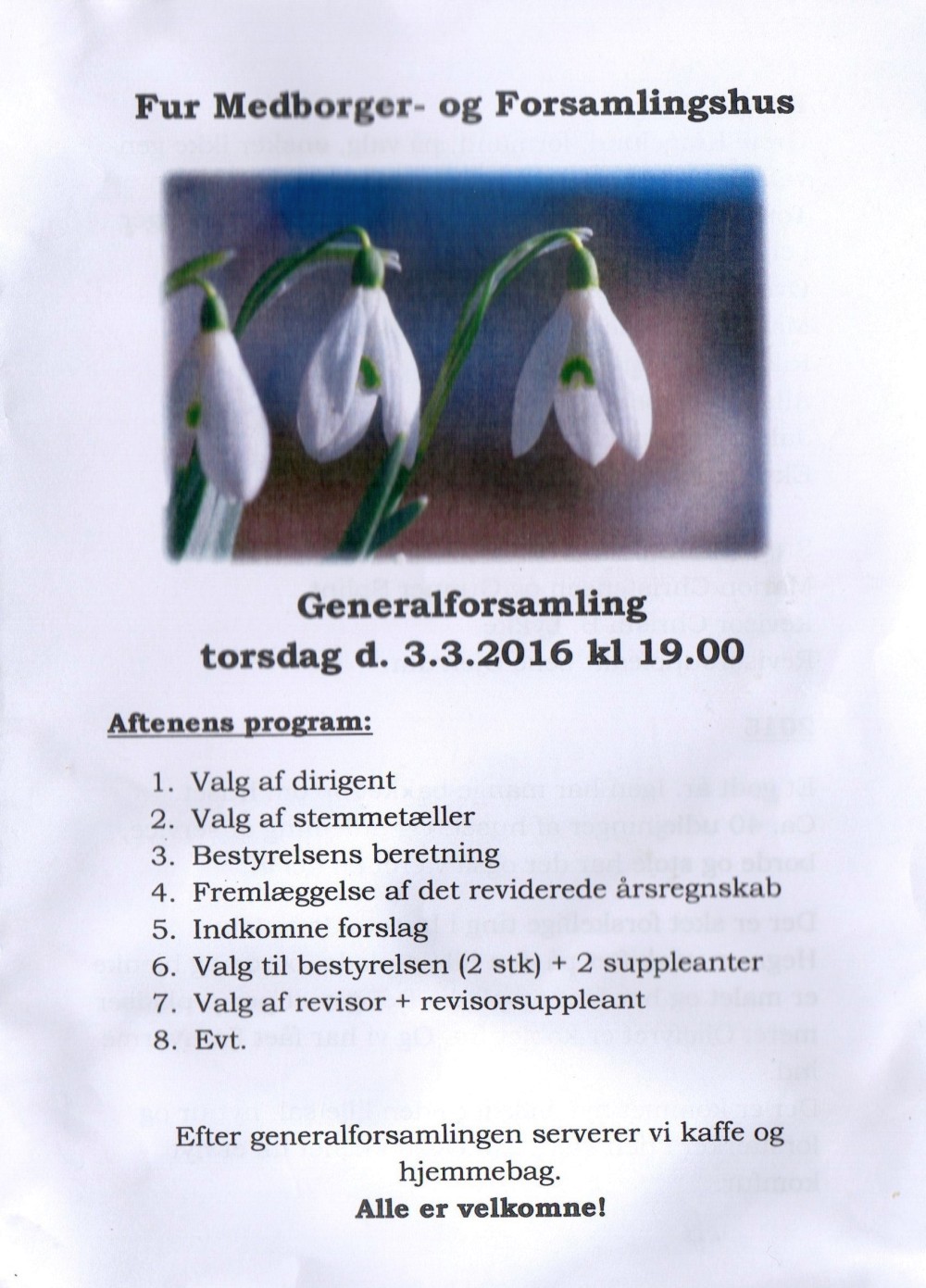 Torsdag den 3. marts kl. 19.00 afholder Fur Forsamlingshus generalforsamling i Fur Forsamlingshus.