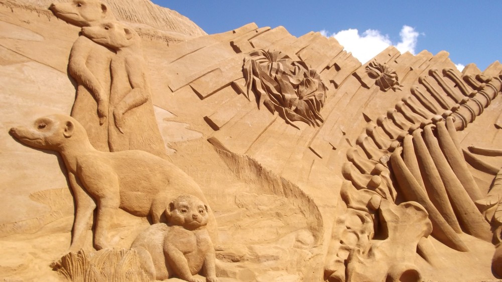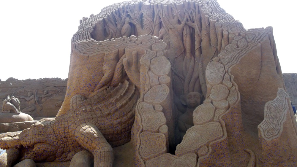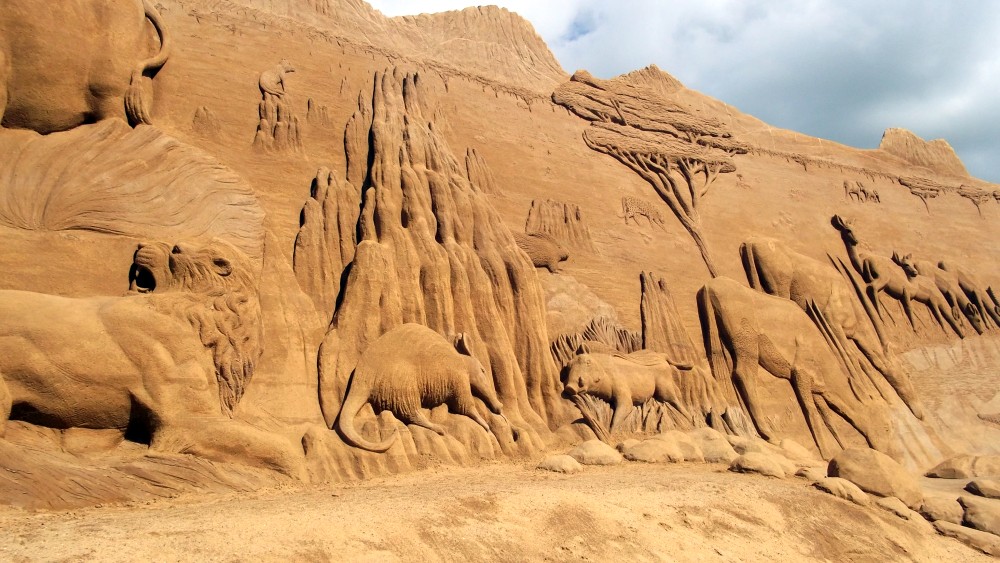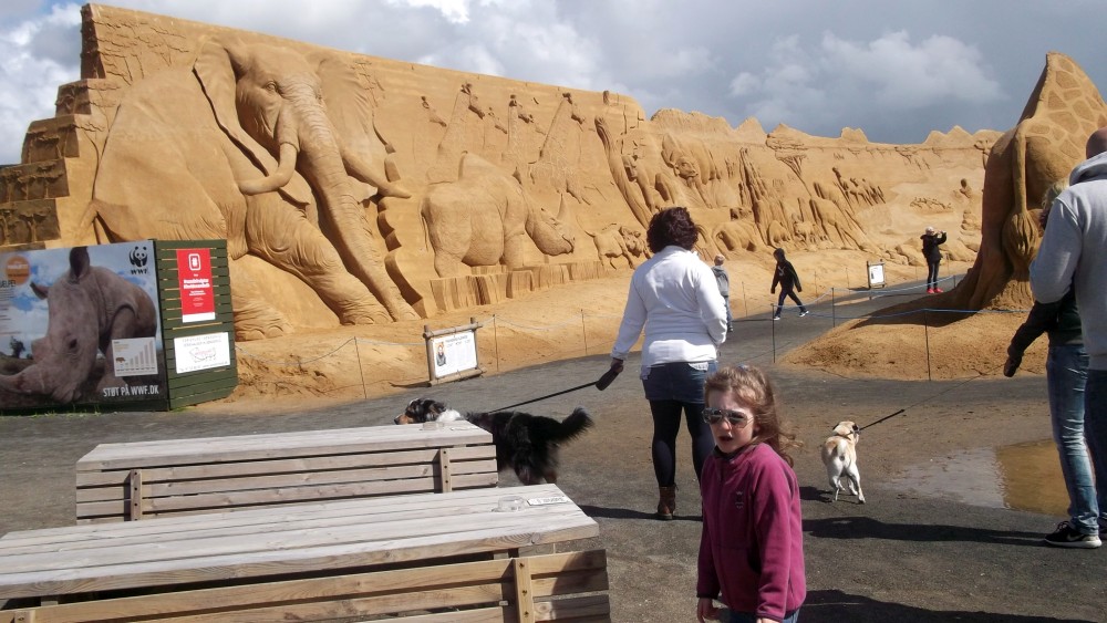 Der havde været 34 af verdens dygtigste sandskulpturarbejdere i gang med at lave det enestående flotte kunstværk. som bestod af en 200 m. lang og 7 m. stor væg, foruden nogle enkeltstående kunstværker og de havde alle sammen temaet: "Afrikas vilde dyr".