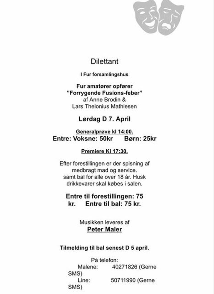 Lørdag den 7. april er det dilettant i Fur Forsamlingshus opført af Fur Amatører.