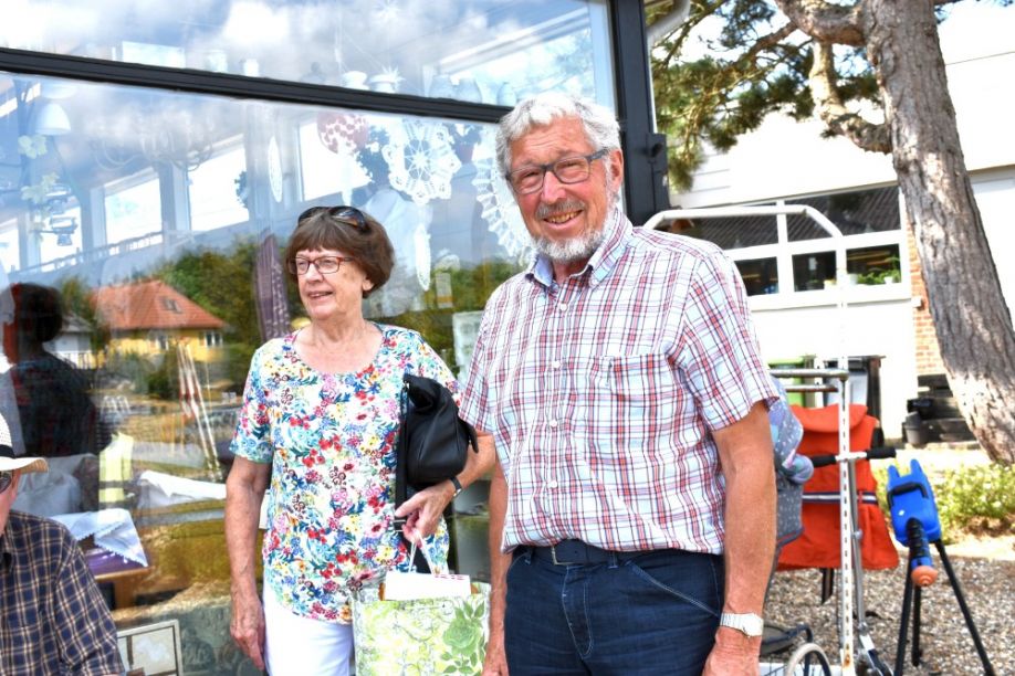 Vi havde den store glæde, at Else og Ankjær Poulsen, der for 30 år siden startede genbrugsbutikken op sammen med Vagn Villadsen, kom og var hos os et stykke tid, hvor vi sad udenfor i det dejlige sommervejr, som var rigelig varmt, men heldigvis lidt i skygge under Lisbeth og Leos store træer, så det var til at holde ud.