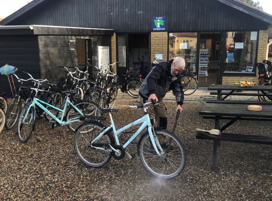 Foto viser Christian som servicerer turistkontorets udlejningscykler.