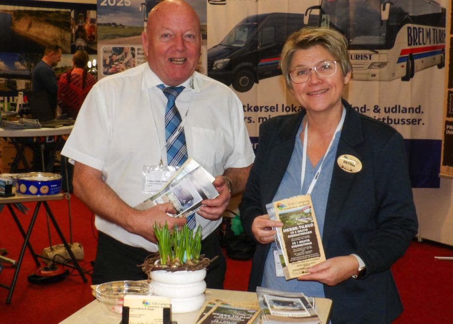 På billedet ser du Betina Bugge fra Fur Camping og Michael Christensen fra Breum Turist i aktion på Ferie for Alle 2025.